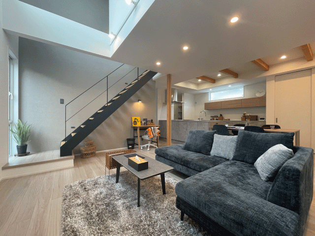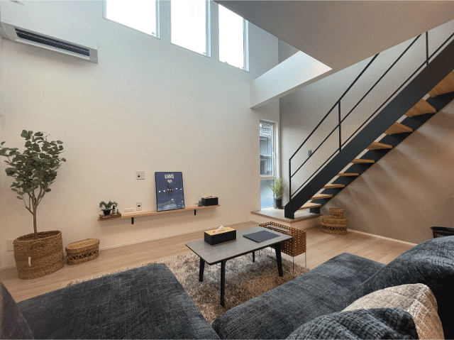 リビングの一部には吹き抜けを設け、大きな窓から柔らかな光が降り注ぐ開放的な空間を実現しました。