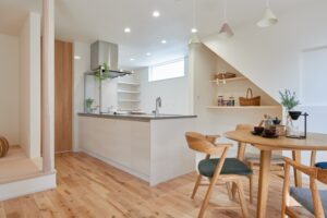 バーチの無垢床に触れ、吹抜けの開放感を感じ、計算し尽くされた家事動線を体感する。