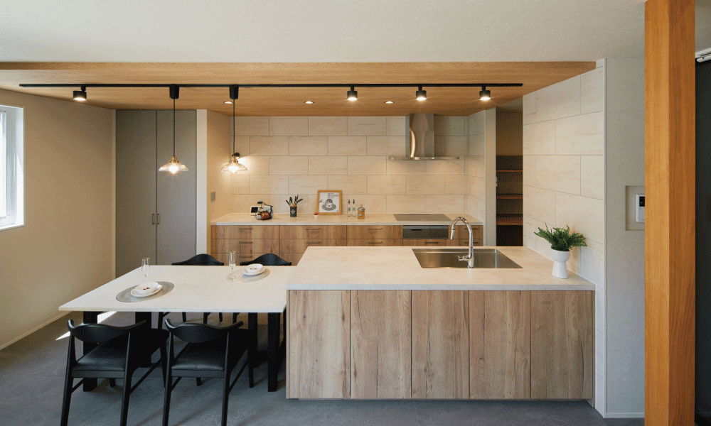 平屋ならではの天井高を活かし、ダイニングには勾配天井を採用し開放感を。