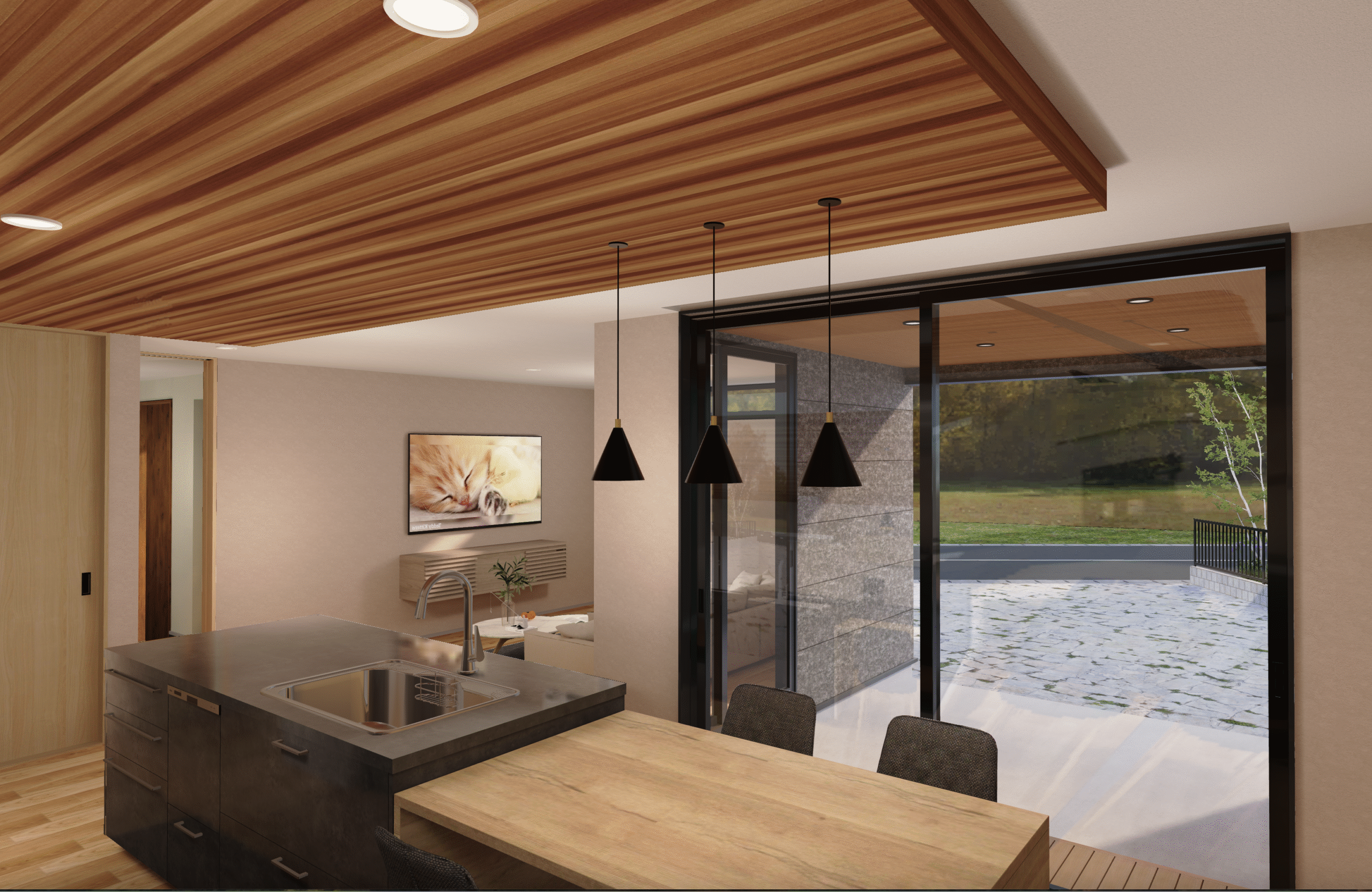 左奥にリビングがあり、リビングとキッチンダイニングのエリアが