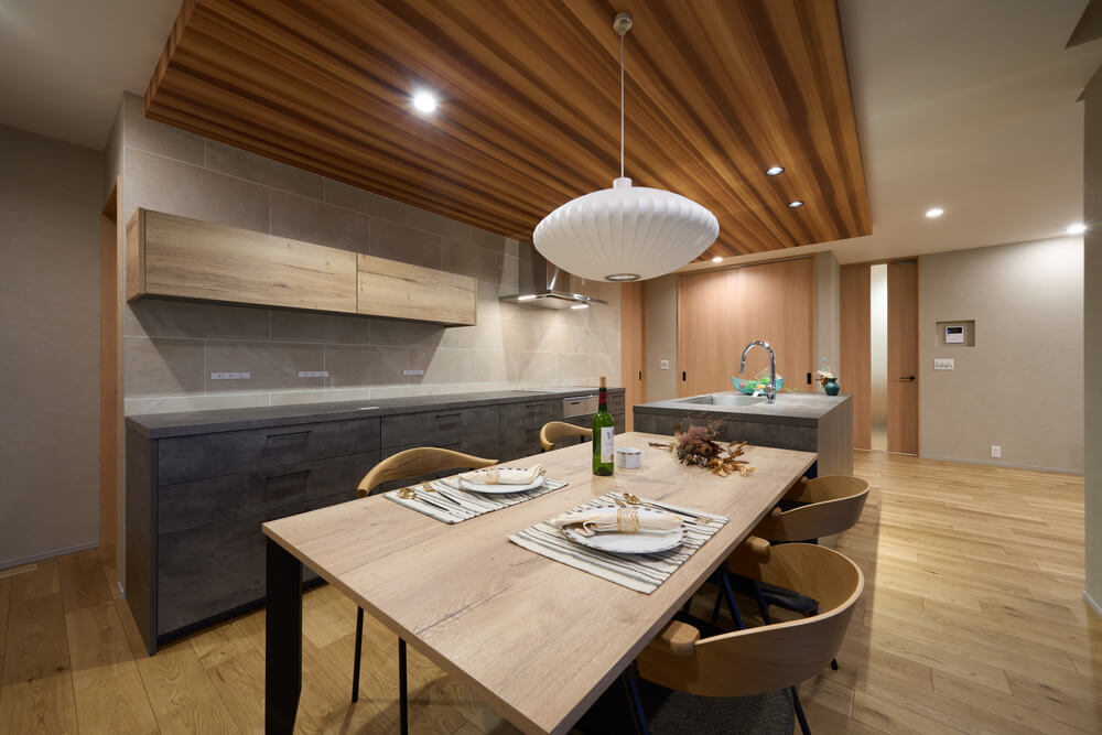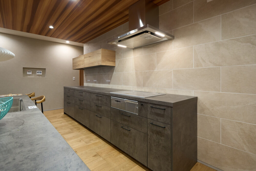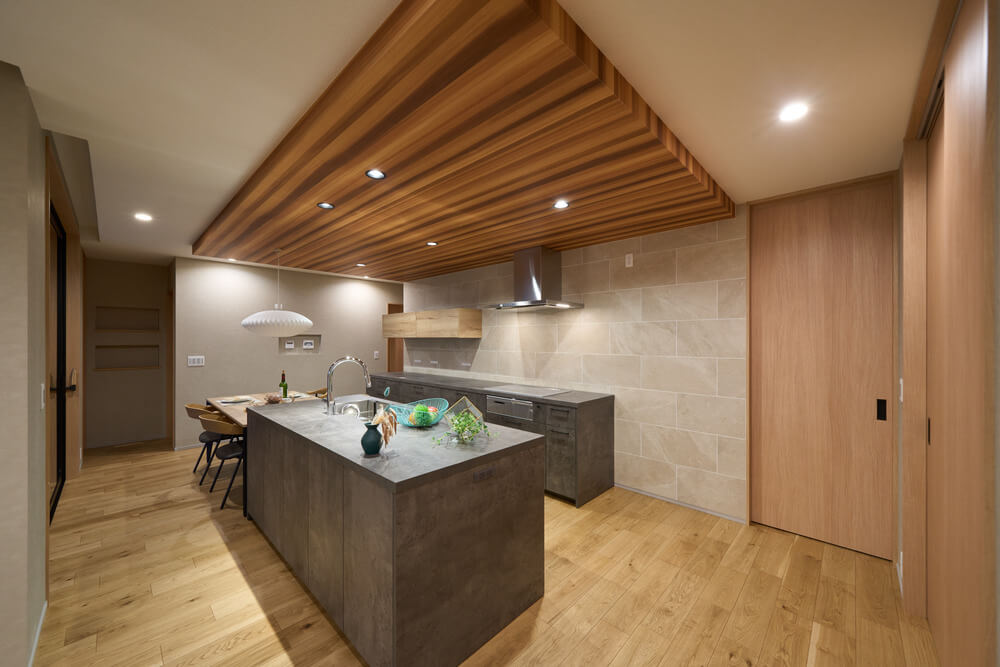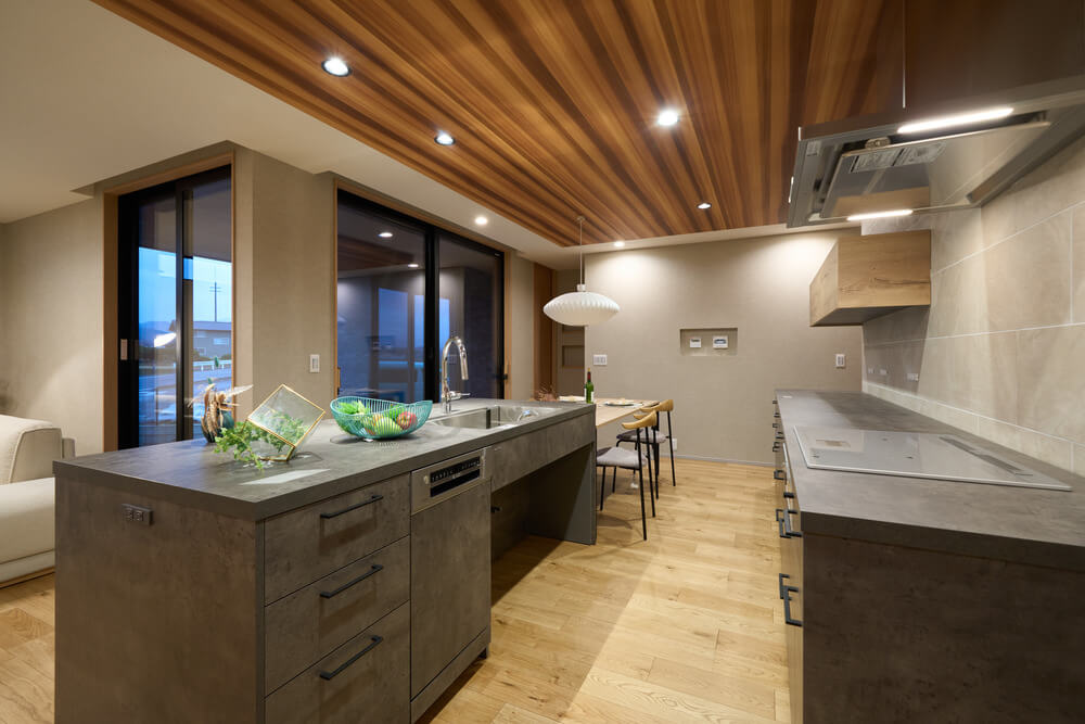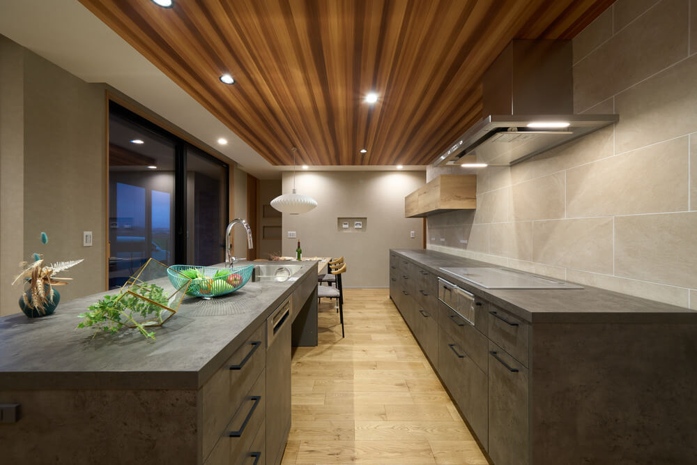 一瞬で目を奪われるグラフテクトのデュエアイランドキッチンはシンクとコンロがアイランドと背面で分かれているので作業台が広く、家族や友人など大人数が集まって料理ができる誰もが羨む特別な造り