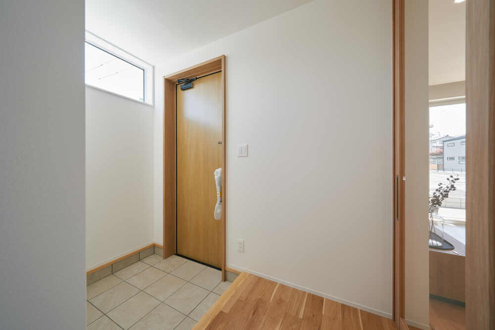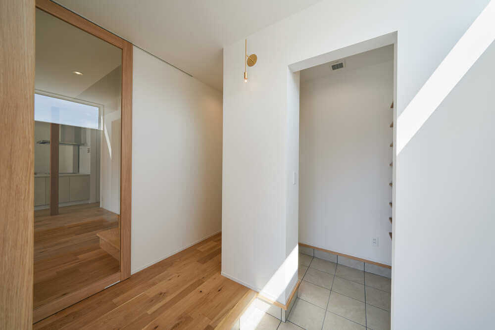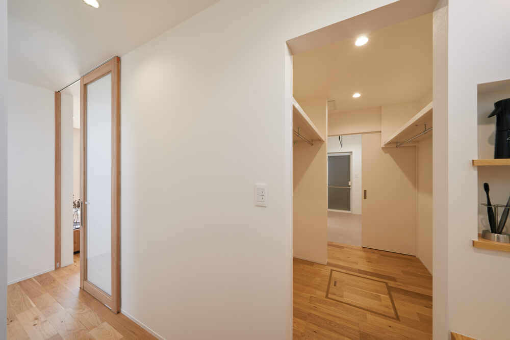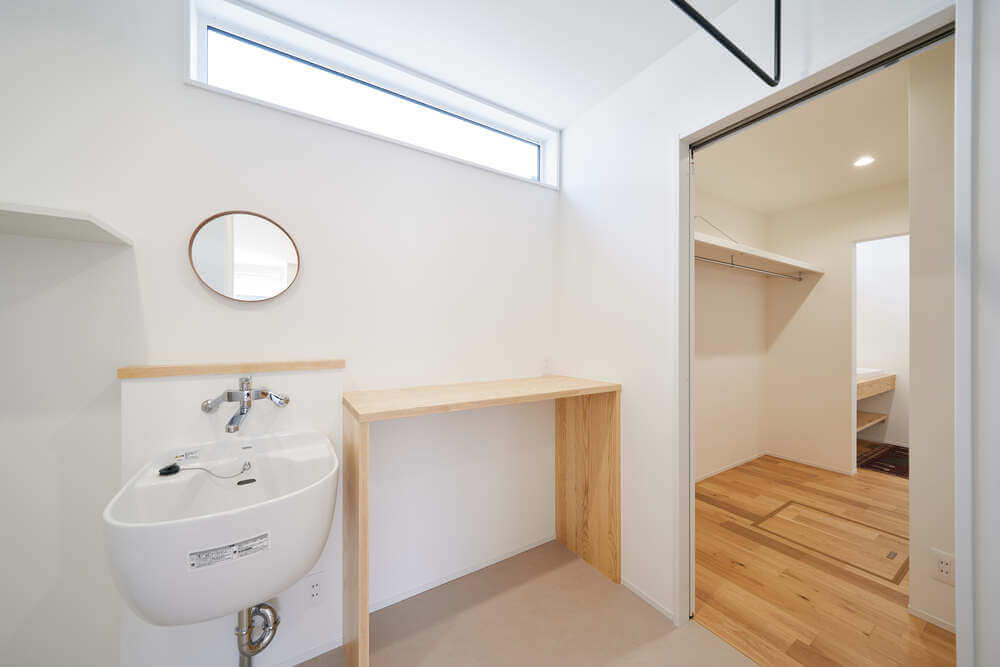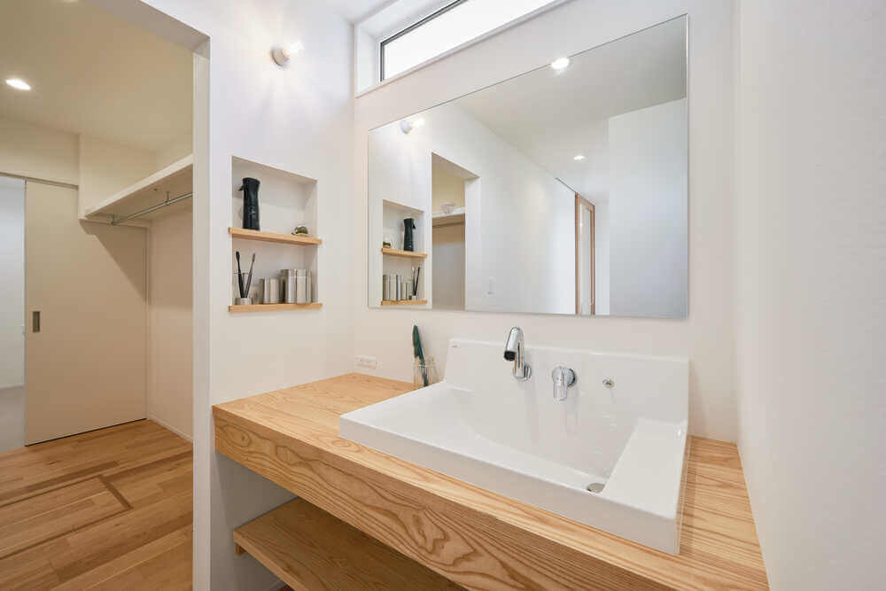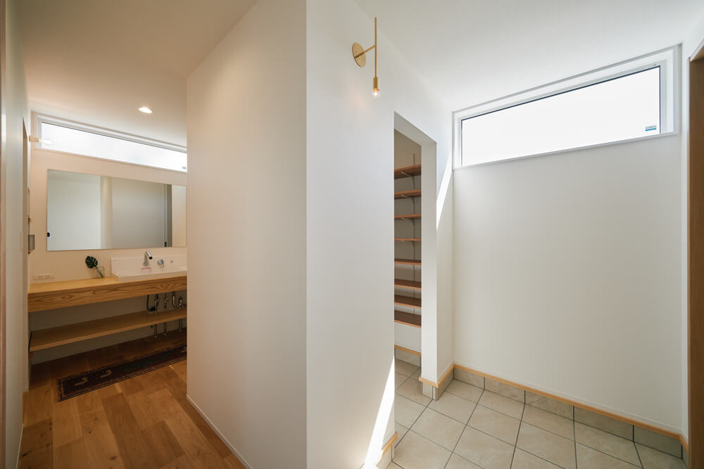 帰宅後すぐに手洗い着替えができる動線はリビングに汚れを持ち込まない今のスタンダード。 階段下のデッドスペースを有効活用した収納は、使う場所に・使う分の収納をという設計が